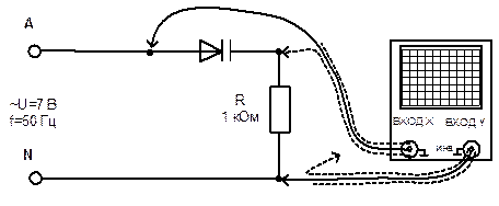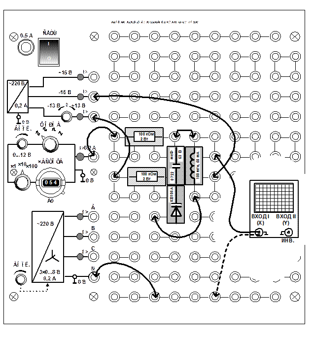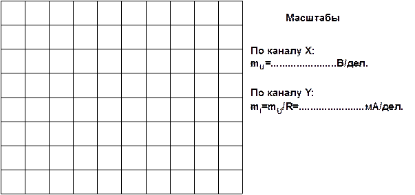 · Соберите цепь согласно принципиальной схеме (рис.2.4.1). На горизонтальный вход (Х) подайте напряжение с варикапа, а на вертикальный (Y) – напряжение с сопротивления, пропорциональное току. Включите инвертирование канала Y, чтобы положительному току соответствовало отклонения луча осциллографа вверх.