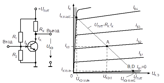 На рис. 2.7.1 изображены простейшая схема транзисторного усилителя с общим эмиттером и поясняющая диаграмма. Резистор R К является сопротивлением нагрузки, на резисторах R 1 и R 2 выполнен делитель напряжения, создающий постоянный ток в цепи база – эмиттер. Он поддерживает транзистор в открытом состоянии при отсутствии входного сигнала, благодаря чему через сопротивление R К протекает постоянный ток. При этом напряжение на транзисторе U КЭ(I К) = U ПИТ – R К I К. Точки пересечения этой прямой с вольтамперными характеристиками I К(U КЭ) позволяют определить напряжение и ток в транзисторе при любом токе базы. В зависимости от начального положения точки покоя (при отсутствии входного сигнала) различают несколько классов усиления. В класса А точка покоя выбирается в примерно в середине активной зоны от I К МАКС до I К ММИН, в которой характеристики транзистора близки к линейным (точка А на поясняюще диаграмме). В этом случае при подаче на базу переменного сигнала (например, синусоидального) в токе базы появляется переменная составляющая, что вызывает соответствующие изменения тока I К и напряжения U КЭ. Рабочая точка при этом перемещается по прямой линии U ПИТ – R К I К между зонами насыщения (I К МАКС) и отсечки (I К МИН). Если входной сигнал не превышает допустимую величину, то происходит пропорциональное усиление всего сигнала. При превышении допустимого уровня наступает ограничение выходного сигнала на уровнях I К МАКС и I К МИН по току и на уровнях U КЭ МИН и U КЭ МАКС по напряжению.