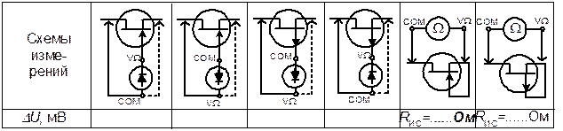 · Переключите мультиметр в режим тестирования диодов и измерьте падение напряжения на p-n переходах транзисторов по первым четырём схемам, приведённым в табл. 2.8. Примечание: в режиме тестирования диодов мультиметр измеряет падение напряжения на открытом p-n переходе при определённом токе (примерно 1 мА), создаваемом самим прибором. В обратном направлении он показывает обрыв цепи (1 в старшем разряде). · Переключите мультиметр в режим измерения сопротивлений и измерьте сопротивление «сток – исток» при U ЗИ = 0 по двум последним схемам табл. 2.8.1.