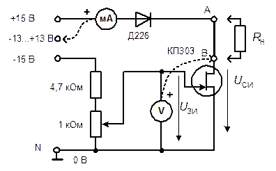 · Соберите цепь для снятия характеристик транзистора (рис. 2.8.2). Диод включен в схему для предотвращения подачи отрицательного напряжения на транзистор при снятии выходных характеристик, а между точками А и В включена перемычка, удалив которую можно включить в цепь стока сопротивление нагрузки.