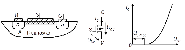 Структура, условное обозначение и стоко-затворная характеристика МОП-транзистора с индуцировнным каналом типа n показана на рис. 2.9.2. В подложке типа р изготовлены только небольшие области противоположного типа проводимости. При подаче на затвор положительного напряжения относительно истока к затвору будут притягиваться электроны, в то время как дырки от него будут оттесняться. При некотором напряжении, называемым пороговым (U ЗИпор) под затвором образуется n -слой, перемыкающий n-области под истоком и стоком. Вся стоко-затворная характеристика лежит в области обогащения. В МОП транзисторе с индуцированным каналом типа р структура симметрична, и аналогичные процессы протекают при отрицательном напряжении на затворе.