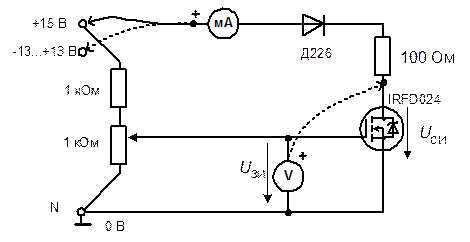 · Соберите цепь для снятия характеристик транзистора (рис. 2.9.3). Диод Д226 включен в схему для предотвращения подачи отрицательного напряжения на транзистор при снятии выходных характеристик. Диод, показанный внутри микросхемы IRFD024 является паразитным элементом, обусловленным конструкцией p-n переходов в транзисторах подобного типа..