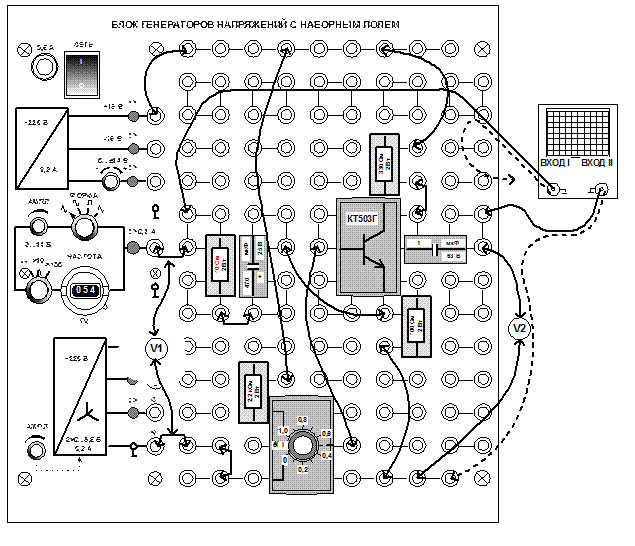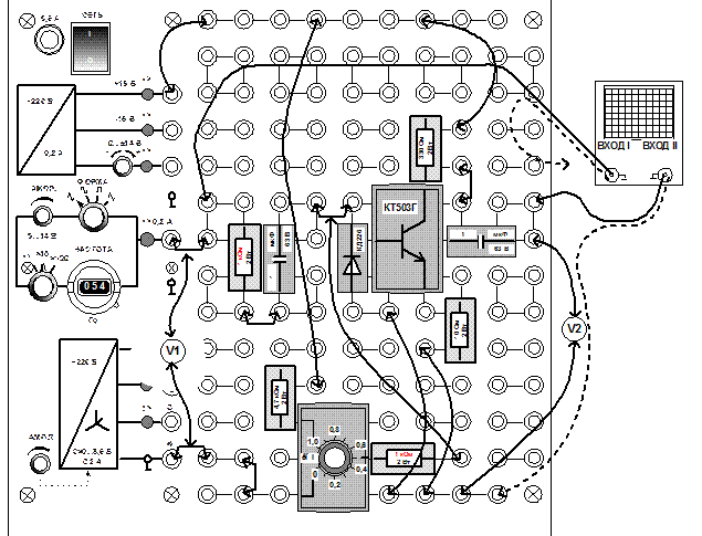 Рис. 3.1.2 · Включите осциллограф для наблюдения по двум каналам одновременно(канал I – 0,5 В/дел., канал II – 5 В/дел). Включите мультиметры для измерения переменных напряжений. Примечание. Не используйте предел измерения 200 mV для измерения переменных напряжений, содержащих постоянную составляющую! Другие пределы использовать можно. · Включите блок генераторов напряжений и установите частоту синусоидального напряжения 1 кГц, а амплитуду сначала равной нулю. · Изменяя напряжение смещения на базе поворотом ручки потенциометра вправо и влево, установите напряжение покоя U КЭ примерно в середине диапазона его изменения. Подайте на вход усилителя синусоидальное напряжение и, регулируя его амплитуду, установите на входе максимальный сигнал, соответствующий неискажённому напряжению на выходе. При необходимости уточните положение точки покоя. · Запишите в табл. 3.1.1 входное и выходное напряжения. Для определения тока базы и тока коллектора измерьте также напряжения на резисторе 1 кОм (U RВХ) во входной цепи и на резисторе 330 Ом в цепи коллектора (U RН). · Вычислите ток базы (входной ток) и ток коллектора (выходной ток), разделив напряжения на соответствующие сопротивления и также запишите их в табл. 3.1.1. · Определите коэффициенты усиления по напряжению, току, и мощности (kP = kU·kI). · Для определения выходного сопротивления подключите к выходу (параллельно вольтметру V2) нагрузочное сопротивление, указанное в таблице. При этом напряжение на выходе уменьшится от U ВЫХ, которое уже записано в табл. 3.1.1, до U ВЫХ1. Запишите это значение также в табл. и вычислите выходное сопротивление по формуле: