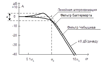 Значения АЧХ в полосе пропускания не должно превышать некоторого максимального значения А макс и быть не меньше некоторого минимально допустимого значения А мин. Разность этих значений а = А макс - А мин называют отклонением АЧХ в полосе пропускания. В полосе задерживания АЧХ характеризуется крутизной наклона в начале полосы задерживания DА / Dw [дБ/декаду]. Крутизна наклона увеличивается с увеличением порядка фильтра, т.е. порядка полинома, аппроксимирующего АЧХ. Границы полосы пропускания фильтров часто определяют как частоту среза w с, т.е. частоту, при которой выходной сигнал уменьшается в Наиболее часто реализуются АЧХ фильтров Баттерворта, Чебышева и Бесселя, названные так по виду полиномов аппроксимирующих АЧХ идеальных фильтров. АЧХ фильтров Баттерворта в полосе пропускания изменяются монотонно, а фильтров Чебышева – колебательно. В начале полосы задерживании АЧХ фильтра Чебышева имеет более крутой наклон, чем ФЧХ фильтра Баттерворта. На рис.3.8.1 изображены АЧХ Баттерворта и Чебышева фильтра низкой частоты (ФНЧ) второго порядка.