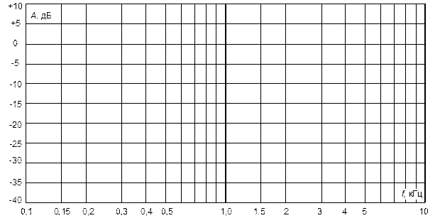 · Соберите цепь ФНЧ (рис.3.8.2а и 3.8.3) с параметрами элементов, соответствующих фильтру Баттерворта (табл.3.8.1). · Включите блок генераторов напряжений и установите на входе фильтра синусоидальное напряжение U 1 = 5 В (действующее значение). Примечания: 1 ) Не используйте множитель «× 100», так как на этом диапазоне выходное напряжение генератора снижается. 2) На линейных участках АЧХ не обязательно снимать все точки, указанные в табл.3.8.1. · Изменяя частоту напряжения генератора согласно табл.3.8.1, снимите зависимость напряжения на выходе фильтра от частоты U 2(f). · Рассчитайте значения амплитудно-частотной характеристики в децибелах и на рис. 3.8.4 постройте график A (f). · По графику определите и укажите на рисунке частоту среза f с, отклонение а частотной характеристики в полосе пропускания и наклон АЧХ в точке f = f c. · Повторите все опыты для других схем и параметров, указанных в табл.3.8.1. · Сделайте сравнение характеристик фильтров Баттерворта и фильтров Чебышева