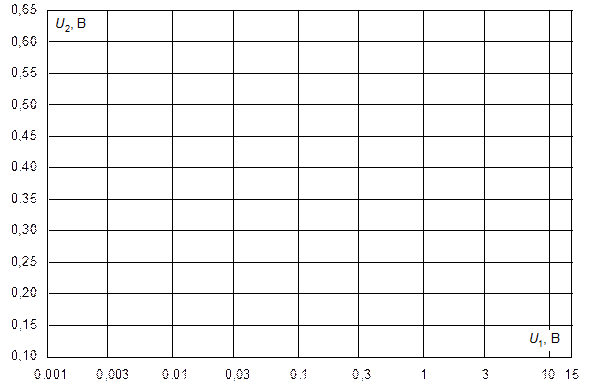 · Устанавливая регулятором напряжения «-13…+13 В» напряжения U 1, указанные в табл. 3.9.1 (положительной полярности!), снимите зависимость U 2(U 1). По мере увеличения входного напряжения меняйте верхнее сопротивление делителя сначала на 10 кОм, затем – на 1 ком, и, наконец, вставьте вместо него перемычку. · На рис. 3.9.3. постройте график U 2(U 1) который в принятом логарифмическом масштабе должен быть примерно прямолинейным. · Уберите из схемы транзистор, а диод переверните катодом вниз. Ещё раз снимите зависимость U 2(U 1) и на том же рисунке постройте график. · Сравните графики и объясните их различие. Таблица 3.9.1