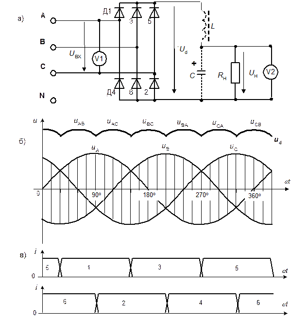 Потребители большой мощности питаются выпрямленным трехфазным переменным током. Несколько большая в сравнении с однофазным выпрямителем стоимость трехфазного выпрямителя многократно окупается за счет более простого сглаживания выходного напряжения. Чаще всего используется мостовая схема выпрямления трёхфазного напряжения (рис. 4.2.1а). Она состоит из 6 вентилей (полупроводниковых диодов) и питается линейными напряжениями трёхфазного источника. На рис. 4.2.1б показаны кривые фазных напряжений источника питания uA, uB, uC и кривая выпрямленного напряжения ud. Выпрямленное напряжение образуется разностью фазных напряжений, т.е. линейными напряжениями. В нечётной группе вентилей в открытом состоянии находится тот вентиль, у которого на аноде положительное наибольшее напряжение, а в чётной – тот вентиль, у которого на катоде отрицательное наименьшее напряжение. Разность наибольшего положительного напряжения и наименьшего отрицательного напряжения и есть выпрямленное напряжение на выходе трёхфазного моста. Эта разность на рис. 4.2.1б заштрихована. Так на отрезке 30o< wt< 150o открыт диод Д1, так как напряжение uA на этом отрезке имеет наибольшее значение. В чётной группе вентилей на отрезке 90o< wt< 240o открыт диод Д2, так как у него на катоде напряжение uC имеет наименьшее значение. При wt= 150o диод Д1 закрывается и открывается диод Д3, а при wt= 240o закрывается диод Д2 и открывается Д4. На рисунке 4.2.1в показаны графики токов в диодах. Средняя величина выпрямленного напряжения в трёхфазном мосте
