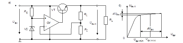 Компенсационный стабилизатор напряжения (рис. 4.4.1а) представляет собой замкнутую систему автоматического регулирования и включает в себя регулирующий элемент (транзистор VT), сравнивающее устройство (операционный усилитель ОУ) и источник опорного напряжения (стабилитрон VD). Нагрузка R н включена последовательно с регулирующим элементом (в цепь эмиттера).