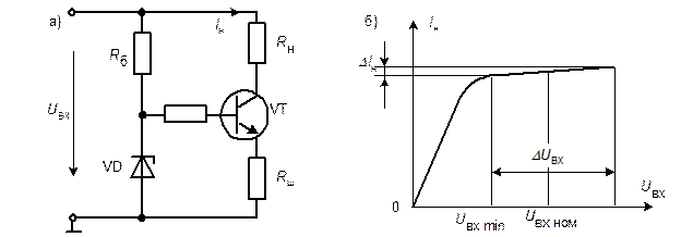 где U оп – напряжение источника опорного напряжения (в данном случае, стабилитрона VD), а U бэ @ 0,5…0,8 В – прямое напряжение между базой и эмиттером. При уменьшении тока неважно из-за уменьшения входного напряжения или увеличения сопротивления нагрузки напряжение на шунте уменьшается, и разность напряжений на базе и эмиттере увеличивается. Это приводит к увеличению тока базы и увеличению тока коллектора и эмиттера до первоначального значения. Однако, если входное напряжение упадёт ниже значения, при котором обеспечивается минимальный ток стабилизации стабилитрона, ток нагрузки будет изменяться примерно пропорционально входному напряжению (рис.4.4.2б). Работа стабилизатора нарушается также при увеличении сопротивления нагрузки выше некоторого предельного значения.