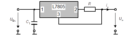 В стабилизаторах с фиксированным выходным напряжением имеется возможность его увеличения, и даже регулирования в некоторых пределах. Для этого в цепь стабилизатора включают стабилитрон как показано на рис. 4.5.1б. При этом выходное напряжение повышается на величину напряжения стабилизации стабилитрона U ст. Для регулирования выходного напряжения на общий вывод микросхемы нужно подать регулируемое напряжение с делителя (желательно через эмиттерный повторитель для уменьшения влияния сопротивления делителя на ток внутренних цепей управления микросхемы). На рис. 4.5.3 показана схема источник стабилизированного тока. На добавочном резисторе R микросхема поддерживает номинальное выходное напряжение (в данном случае 5 В). Поскольку ток через общий вывод 3 микросхемы невелик, через нагрузку будет протекать такой же ток, как и через сопротивление R, т.е. I н = U вых ном/ R независимо от сопротивления нагрузки.