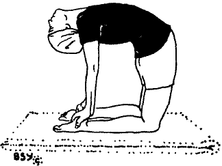 Постарайтесь расслабить всё тело, особенно мышцы спины. Используя мышцы спины, мягко толкайте вперёд бёдра, таз, и живот; при этом мышцы спины должны оставаться в расслабленном состоянии, а руки — сохранять контакт с пятками. Чем больше расслаблены мышцы спины, тем дальше можно будет выдвинуть тело вперёд. Выполняя это движение, вы обнаружите, что сжатие спины будет увеличиваться, особенно нижней части (в поясничной области). Будьте осторожны и не перенапрягайтесь. По мере практики и при достаточном расслаблении мышц спины, вы сможете принимать конечную позу, показанную на рисунке выше. Следите за тем, чтобы мышцы ног были расслаблены. Вес тела должен полностью приходиться на колени; поначалу это может оказаться невозможным, но по мере практики вы будете легко этого достигать. Руки не должны нести никакой нагрузки; фактически, они выполняют противоположную функцию. Они должны как якоря удерживать плечи, чтобы сохранять прогиб спины. Другими словами, руки не служат опорой для плеч, а, напротив, оттягивают их вниз, позволяя усилить изгиб спины. Как можно больше расслабьте мышцы шеи, ног, рук и спины. Оптимальное расслабление спины очень важно, так как оно позволяет верхней части тела провисать под действием силы тяжести; при этом спина прогибается в максимальной степени, не встречая сопротивления мышц. Дышите естественно, позволяя изгибу спины усиливаться при выдохе. Оставайтесь в конечной позе пока это вам удобно. Затем вернитесь в исходное положение, напрягая все мышцы и выполняя все описанные выше действия в обратном порядке. Следите за тем, чтобы тело опиралось на одну руку и поворачивалось вокруг неё, в то время как его противоположная сторона движется вперёд. Выполняя это движение, не спешите.