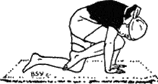 Встаньте на колени, слегка раздвинув ноги. Наклонитесь вперёд и положите руки на пол, ладонями вниз. Положение ладоней нужно подобрать так, чтобы при туловище, параллельном земле, руки и бёдра располагались вертикально. Иными словами, руки должны находиться непосредственно под плечами. Расслабьте всё тело. Медленно согните правую ногу, подтягивая бедро к груди. Одновременно, выдыхая, выгните спину вверх и наклоните голову навстречу поднимающемуся колену. При этом правая ступня не должна касаться пола. В конце этого движения постарайтесь коснуться колена подбородком или носом, прижимая правое бедро к груди. В течение секунды или двух смотрите на колено, задерживая дыхание. Затем, вдыхая, медленно отодвигайте колено назад. Не опускайте колено на пол, а продолжайте качающееся движение, чтобы колено перемещалось назад и вверх позади тела, а правая ступня поднималась над полом.