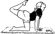 Одновременно постепенно вытягивайте правую ногу, чтобы в итоге она оказалась выпрямленной и направленной перпендикулярно рукам. Затем согните правое колено, чтобы правая ступня в итоге указывала в направлении затылка. Во время перехода из положения с бедром, прижатым к груди (рис. 1), в данное положение следует медленно отклонять голову назад и прогибать спину вниз, чтобы принять позу, показанную на рис.2. Попробуйте подтянуть затылок как можно ближе к пальцам правой ноги. В этой позе ненадолго задержите дыхание. Продолжая задерживать дыхание, выпрямите правую ногу, чтобы она снова указывала назад. Затем, выдыхая, согните правую ногу и вернитесь в положение, показанное на рис. 1. Это один цикл. Проделайте ещё несколько циклов. Затем повторите те же действия с левой ногой, держа правую ногу прижатой к полу.