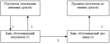Рис. 1. Схема расчетов платежными поручениями 1. покупатель (плательщик денежных средств) предоставляет в банк платежное поручение в четырех (или пяти) экземплярах и получает назад четвертый экземпляр в качестве расписки банка; 2. банк, обслуживающий покупателя, на основании первого экземпляра платежного поручения списывает денежные средства со счета покупателя; 3. банк, обслуживающий покупателя, направляет в банк, обслуживающий продавца, два экземпляра платежного поручения и денежные средства; 4. банк, обслуживающий продавца, используя второй экземпляр платежного поручения, зачисляет денежные средства на счет продавца (получателя денежных средств); 5. банки выдают своим клиентам выписки из расчетных счетов.
