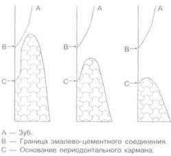 Рис. 7.7. Различные уровни прикрепления эпителия десны при одинаковой глубине кармана. а. Десневая бороздка, уровень прикрепления эпителия десны в норме (на расстоянии края десны и цементно-эмалевого соединения). б. Уровень прикрепления эпителия десны и глубины периодонтального кармана одинаковы. в. Уровень прикрепления эпителия десны превышает глубину периодонтального кармана.