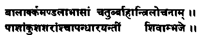 (Баалаарккармандалаабхаасаам чатурббаахаантрилочанаам, Паашаанкушашарааншчаапандхаараянтим Шиваамбхадже)