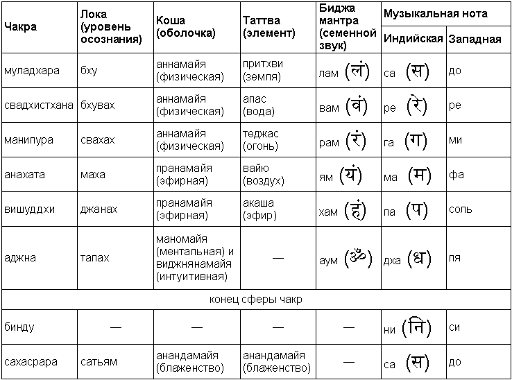 Таблица характеристик чакр