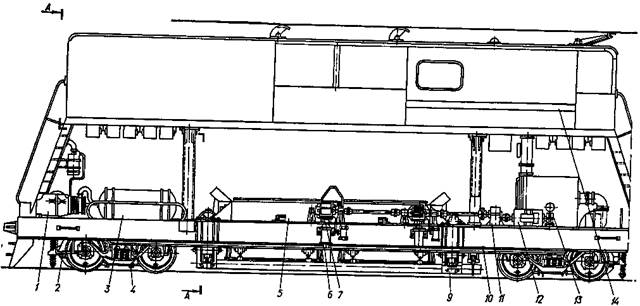 Рис. 176. Вагон-весы. Основная рама 10вагон-весов (рис. 177) — металлическая конструкция из продольных и поперечных балок с металлическим настилом вверху. Рама установлена на двух ходовых тележках 4железнодорожного типа. Каждая тележка снабжена электроприводом 2, расположенным под рамой, и пневматическими тормозами. Карманы 5, жестко соединенные между собой, опираются стойками на рычаги взвешивающего механизма 9, подвешенного к основной раме.