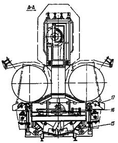 Рис. 177. Разрез вагон-весов: 1-компрессор; 2- электропривод с тормозами; 3- воздухосборник; 4- ходовая тележка; 5- карманы; 6- пневматический привод качения; 7- редуктор; 8- трансмиссионный вал; 9- взвешивающий механизм; 10- рама; 11- редуктор; 12- электродвигатель; 13- тормоз; 14- кабина управления; 15- откидные дверцы; 16- пневматический цилиндр; 17- шестерня.