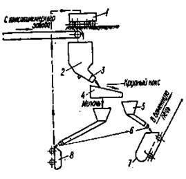 Рис. 179. Схема расположения оборудования для подачи кокса: 1- вагон; 2- коксовый бункер; 3- задвижка; 4- грохот; 5- коксовые весы; 6- затвор; 7- скип; 8- скип подъемника коксовой мелочи.
