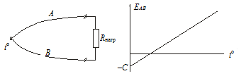 Материалы, используемые для изготовления термопар: платина, иридий, золото, родий, и их сплавы. Кроме того, могут быть использованы более дешевые материалы: сталь, медь, никель, нихром, константан, хромель, алюмель, копель и т.д. Схема включения термопары под нагрузку и ее характеристика изображены на рис. 4.20.