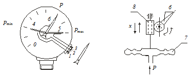 а б Рис. 5.16. Электроконтактный манометр: а – конструкция; б – принцип действия; 1, 2, 3 – выходные электрические контакты; Стрелки 4 и 5 фиксируются на выбранных давлениях. При изменении давления деформируется мембрана и червячная пара 8 преобразует возвратно поступательное движение X, обозначенное стрелками, во вращательное. Вращательное движение передается стрелке 6, которая перемещается по шкале в диапазоне Р min – Р max. При достижении крайних значений стрелка 6 входит в соприкосновение со стрелками 4 или 5, соответственно обеспечивая электрический контакт с ними. 5) датчики уровня жидкости (рис. 5.17–5.19). Уровни жидкости необходимо измерять в различных резервуарах, предназначенных для ее хранения или на уровне пола в помещениях с возможным затоплением.