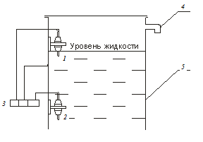 Рис. 5.19. Электродный датчик уровня жидкости: 1 – электрод верхнего уровня; 2 – электрод нижнего уровня; Электродный датчик – самый простой и дешевый, но недостаточно надежный элемент. В случае ненадежного срабатывания датчика, сопровождающегося переполнением резервуара, лишняя вода сливается через трубу аварийного слива 4. 6) датчики расхода жидкости. Основным элементом этого датчика (рис. 5.20) является преобразователь расхода жидкости в частоту вращения его вала. Вал преобразователя жестко соединен с тахогенератором. Тахогенератор на выходе выдает напряжение, пропорциональное расходу жидкости. Это напряжение подается на вольтметр, имеющий градуировку в метрах кубических за секунду, и указывает расход жидкости.