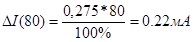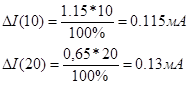 Решение: Для записи результатов формируем таблицу (Таблица 3), в столбцы которой будем записывать измеренные значения I, абсолютные ∆I и относительные δI погрешности. Класс точности амперметра задан в виде двух чисел, разделенных косой чертой. Следовательно, относительная погрешность, выраженная в процентах, во всех точках шкалы должна удовлетворять следующему соотношению: δI ≤ [ a + b(I k / I − 1) ],%. В данном случае, а=025; b=0,1; Ik=100 мА. Таким образом, получаем δI ≤ [0,25+ 0,1(100 / I − 1) ],%. При решении задачи рассмотрим худший случай δI = [ 0,25 + 0,1(100 /I − 1) ],%. Это соответствует значениям δI = ± [ 0,25 + 0,1(100 / I − 1) ],%. Примем во внимание опыт решения предыдущих задач, из которого видно, что результаты вычисления, выполненные для положительных и отрицательных значений погрешностей, численно совпадают друг с другом и отличаются только знаками "+" или "-", поэтому дальнейшие вычисления будем производить только для положительных значений относительной погрешности δI = ± [ 0,25 + 0,1(10 0/ I − 1) ],%, но при этом будем помнить, что все значения второго и третьего столбцов табл. 3 могут принимать и отрицательные значения. δI(0) = ± [ 0,25 + 0,1(100 / 0 − 1) ]= δI(10) = ± [ 0,25 + 0,1(100 / 10 − 1) ]= δI(20) = ± [ 0,25 + 0,1(100 / 20 − 1) ]= δI(40) = ± [ 0,25 + 0,1(100 / 40 − 1) ]= δI(50) = ± [ 0,25 + 0,1(100 / 50 − 1) ]= δI(60) = ± [ 0,25 + 0,1(100 / 60 − 1) ]= δI(80) = ± [ 0,25 + 0,1(100 / 80 − 1) ]= δI(100) = ± [ 0,25 + 0,1(100 / 100 − 1) ]= Значения относительной погрешности для остальных измеренных значений сопротивления рассчитываются аналогично. Полученные значения относительной погрешности заносим в третий столбец табл. 3.