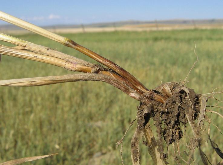 Залалданған өскіндердің колеоптиль ұлпасында түсі сары немесе ашық-қоңыр сызықтар мен созылған дақтар пайда болады. Сонымен қатар өсімдік тамырлары мен жер асты буынаралықтары залалданады. Дақтар өсе келе сабақты орап, ұлпалары шіріп, залалданған бөліктен иіліп сынады. Өсімдік түптене бастағанда жер асты буынаралықта бойлаған қоңыр дақтар пайда болады. Саңырауқұлақ 20-27'C температура мен ылғалды ортада жақсы дамиды. Инфекция қоры – тұқым мен топырақ. Тамыр шірігі Fusarium туысына жататын саңырауқұлақтар да қоздырады. Бұл жағдайда жер асты буынаралықтары мен қосымша тамырлары алғаш қызарып, кейін қоңырланып, ыдырайды. Ылғалды ауа-райында саңырауқұлақ конидияларынан тұратын қызыл-сары көпшікшелер түзіледі. Саңырауқұлақ 20-22'C температура мен 40% топырақ ылғалдылығында жақсы дамиды. Кесел белгісі тұқымның өну, өскін, түтіктену және гүлдеу кезеңдерінде білінеді. Қоздырғыш өсімдіктің негізгі және қосымша тамырларын, жер асты буынаралықтарын, сабақ негізін залалдайды. Ауруға шалдыққан өсімдіктің тамырлары мен сабақтарының төменгі бөліктері қоңырланады. Кесел көбінесе теңіз деңгейінен 1000 м биіктіктегі құрғақ, тығыз топырақта шоғырланып кездеседі. Залалданған өсімдіктер аса түптеніп, көптеген сабақ (5-50 дана) түзеді. Кеселге шалдыққан өсімдіктердің биіктігі сауларынан 2-4 есе аласа болады. Залалданған масақтар тығыздау, сәл қысқалау, иректеліп орналасады. Астықтың сызықты (сабақ) тат ауруының қоздырғышы – Puccinia graminis Pers.f.tritici Eriks. саңырауқұлағы. Паразит әр иелі, толық циклды дамиды. Аралық иесі – бөріқарақат және магония. Бөріқарақат жапырағының үстінде қоңыр дақ пайда болып, оның бетінде сары-қоңыр түсті спермагонийлер, ал дақтың астыңғы жағында түсі ақшыл-сары, диаметрі 2-5 мм цилиндр немесе кесе тәрізді эциилер түзіледі. Эциоспоралар шар тәрізді, қабығы түссіз, ұсақ сүйелді, жоғарғы бөлігі қалыңдау. Бұл споралар дәнді дақылдардың сабағын залалдайды (сурет 3). Паразит әр иелі, толық циклды дамиды. Аралық иесі – бөріқарақат және магония. Бөріқарақат жапырағының үстінде қоңыр дақ пайда болып, оның бетінде сары-қоңыр түсті спермагонийлер, ал дақтың астыңғы жағында түсі ақшыл-сары, диаметрі 2-5 мм цилиндр немесе кесе тәрізді эциилер түзіледі.