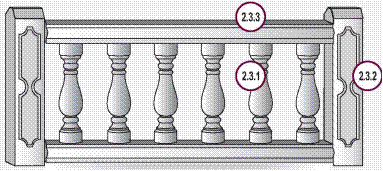 Балясина 2.3.1 (440х110), цена: 5500; Столбик 2.3.2 (1100х155х145), цена: 6900; Перила 2.3.3 (70х1320х150), цена: 8150;