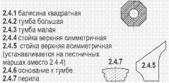Балясина квадратная 2.4.1 (660х110х110). Цена: 6900; Тумба большая 2.4.2 (745х320х260), цена: 13450; Тумба малая 2.4.3 (350х320х260), цена: 9380; Стойка верхняя симметричная 2.4.4 (160х260х110), цена: 5500; Стойка верхняя асимметричная (устанавливается на лестничных маршах вместо 2.4.4) 2.4.5 (350х260х110), цена: 6900; Основание к тумбе 2.4.6 (110х320х320). Цена: 6900; Перила 2.4.7 (130х1220х185), цена: 11250;