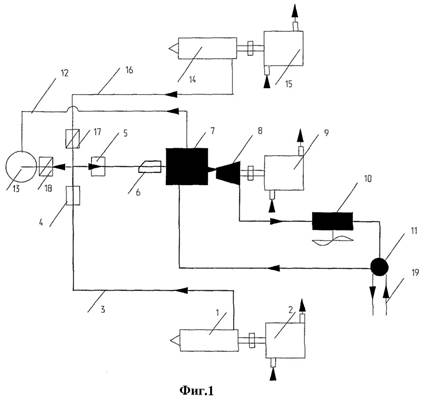 Рисунок 7 – Схема работы КГТУ. Цикловой воздух освобождается от механических примесей и сжимается в компрессоре 1 низкого давления, после чего направляется в промежуточный воздухоохладитель 3 с циркулирующим хладагентом от абсорбционной холодильной машины 12. Охлажденный воздух поступает в компрессор 2 высокого давления. Благодаря повышению удельной массы воздуха при его охлаждении увеличивается массовая производительность компрессора 2 высокого давления 3. Сжатый воздух после компрессора 2 высокого давления 3 поступает в регенератор 7, где подогревается и затем поступает в камеру сгорания 4, а продукты сгорания производят работу в газовой турбине 5, являющейся приводом газоперекачивающего агрегата и/или электрогенератора 6. Отработанные после газовой турбины 5 газы частично направляются в регенератор 7, где подогревают цикловой воздух после компрессора 2 высокого давления 3, смешиваются с остальным отработанным газом и направляются с помощью нагнетательного вентилятора 14 с давлением 2-4 атм в котел-утилизатор 9 с пароперегревателем и промежуточной системой дожигания топлива, где нагревают питательную воду для получения пара с оптимальной температурой. Перегретый пар направляют в паровую турбину или Стирлинг-генератор 10 для выработки дополнительной электроэнергии в электрогенераторе 11, после чего отработанный пар с температурой не ниже 150°С утилизируется сначала тепловоспринимающими элементами абсорбционной холодильной машины 12, а потом поступает в утилизатор 13 остаточного тепла для предварительного подогрева питательной воды котла-утилизатора 9. В холодное время года или в аварийных ситуациях, связанных с возможной остановкой абсорбционной холодильной машины 12, КГТУ может работать с использованием для охлаждения воздуха после компрессора 1 низкого давления эжектора 15 промежуточного охлаждения. В случае отказа или неэффективного использования регенератора 7 отработанные после газовой турбины 5 газы могут направляться непосредственно в паровой контур 8 по дополнительному трубопроводу 16 с установленной на нем запорной арматурой 17. Конструкция КГПТУ и гибкая технологическая схема ее эксплуатации позволяют поддерживать оптимальные условия газоперекачки с утилизацией тепла выхлопных газов как для повышения мощности и КПД, так и для выработки электроэнергии для собственных нужд и прилегающих территорий. Изобретение позволяет повысить мощность ГТУ, коэффициент полезного использования сжигаемого газа, снизить эмиссию токсичных продуктов сгорания, вырабатывать значительную дополнительную электроэнергию для собственных нужд компрессорных станций и прилегающих территорий. Снижение эмиссии оксидов азота и углерода осуществлено за счет промежуточной системы дожигания топлива в котле-утилизаторе с рециркуляцией горячих выхлопных газов после регенератора. ФОРМУЛА ИЗОБРЕТЕНИЯ 1. Комбинированная газотурбинная установка, содержащая ступени многоступенчатого компрессора с расположенными между ними промежуточными воздухоохладителями, камеру сгорания, газовую турбину, регенератор, подключенный по охлаждаемой среде к выходу из газовой турбины, а по нагреваемой среде соответственно к выходу из последней ступени многоступенчатого компрессора, и входу в камеру сгорания, паровой контур с котлом-утилиз