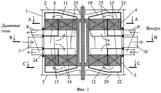 Изобретение относится к области теплоэнергетики и может быть использовано для повышения эффективности работы вращающихся регенеративных теплообменников. Из уровня техники известен регенеративный воздухоподогреватель, содержащий корпус, снабженный патрубками подвода и отвода греющего и нагреваемого потоков, в котором с возможностью вращения относительно продольной оси установлен полый ротор с теплообменной насадкой, во внутренней полости которого размещена прикрепленная к корпусу неподвижная перегородка, разделяющая внутреннюю полость на каналы для греющего и нагреваемого потоков, которые сообщены соответственно с патрубками подвода и отвода греющего и нагреваемого потоков (SU 663971, F 23 L 15/02, 1979). К недостатку данной конструкции можно отнести повышенное сопротивление, обусловленное двойным поворотом потоков, что снижает эффективность работы воздухоподогревателя. Кроме того, выполнение ротора с теплообменной насадкой в виде керамических блоков усложняет конструкцию. Изобретение направлено на повышение эффективности и упрощение конструкции вращающегося регенеративного воздухоподогревателя. Решение поставленной задачи обеспечивается тем, что в регенеративном воздухоподогревателе, содержащем корпус, снабженный патрубками подвода и отвода греющего и нагреваемого потоков, в котором с возможностью вращения относительно продольной оси установлен полый ротор с теплообменной насадкой, во внутренней полости которого размещена прикрепленная к корпусу неподвижная перегородка, разделяющая внутреннюю полость на каналы для греющего и нагреваемого потоков, которые сообщены соответственно с патрубками подвода и отвода греющего и нагреваемого потоков, согласно изобретению каждый из каналов с противоположных сторон перекрыт на конце торцевой полукруглой перегородкой, полый ротор выполнен с теплообменной насадкой в виде набора - пакета чередующихся гладких плоских и гофрированных пластин, установленных радиально относительно продольной оси ротора, при этом патрубки подвода греющего и нагреваемого потоков расположены в корпусе с диаметрально противоположных сторон боковой поверхности ротора, а патрубки отвода греющего и нагреваемого потоков расположены в корпусе со стороны открытых торцов соответствующих каналов или, наоборот, патрубки подвода греющего и нагреваемого потоков расположены в корпусе со стороны открытых торцов соответствующих каналов, а патрубки отвода греющего и нагреваемого потоков расположены в корпусе с диаметрально противоположных сторон боковой поверхности ротора. Кроме того, чередующиеся гладкие и гофрированные пластины ротора образуют клиновидные радиальные каналы, проходное сечение которых уменьшается от периферии к оси ротора. Осевое подключение патрубков подвода (или отвода) потоков к торцам каналов, образованных во внутренней полости полого ротора, при наличии на противоположных торцах глухих полукруглых перегородок исключает двойной поворот потоков, что в сочетании с выполнением теплообменной насадки в виде набора - пакета радиальных чередующихся гладких плоских и гофрированных пластин, образующих клиновидные радиальные каналы с уменьшающимся от периферии к оси ротора проходным сечением, повышает эффективность работы воздухоподогревателя и упрощает его конс