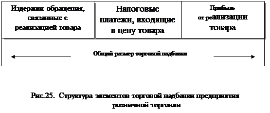 подвижна, так как цена оптовых продавцов в процессе совершения коммерческих сделок может подлежать “уторговыванию”. Верхним пределом формирования торговой надбавки предприятий розничной торговли являются цены спроса конечных покупателей товара. Эта верхняя граница также может варьировать в определенной степени за счет уровня торгового обслуживания покупателей, сопровождающего розничную продажу товаров. Таким образом, “поле” формирования ценовой политики предприятиями розничной торговли хотя имеет четко выраженные рыночные ограничители, в количественном отношении все же является до определенной степени подвижным. Наряду с внешними границами возможного диапазона формирования торговой надбавки розничного торгового предприятия, рассмотрим также состав ее внутренних элементов (рис. 25).