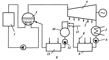 1 — реактор, 2 — промежуточный теплообменник, 3 — парогенератор, 4 — турбогенератор; 5 — конденсатор; 6 — конденсатный насос; 7— пар от отбора, 8 — пар на регенеративный подогреватель; 9, 13 — регенеративные подогреватели низкого и высокого давления; 10 — деаэратор; 11 — пар на деаэратор; 12 — питательный насос