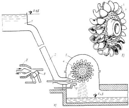 Рис. 2. Ковшовая турбина. а — схема турбинной установки; б — рабочее колесо. Гидротурбины подразделяют на малые, средние и крупные. К малым относятся гидротурбины, у которых диаметр рабочего колеса D 1≤1,2 м при низких напорах и D 1≤0,5 при высоких, а мощность составляет не более 1000 кВт. К средним относятся гидротурбины, у которых 1,2м ≤ D 1 ≤ 2,5 м при низких напорах и 0,5 ≤ D 1 ≤ 1,6 м при высоких, а мощность К крупным относятся гидротурбины, которые имеют D 1 и N т больше, чем у средних. Активные гидротурбины. Наиболее распространенными активными гидротурбинами являются ковшовые (за рубежом их называют турбинами Пельтона). Принципиальная схема ковшовой турбины приведена на рис. 2. Вода из верхнего бьефа 1 подводится трубопроводом 2 к рабочему колесу 4, выполненному в виде диска, закрепленного на горизонтальном или вертикальном валу турбины и вращающегося в воздухе. По окружности диска расположены ковшеобразные лопасти (ковши) 7. На ковшах происходит преобразование гидравлической энергии, заключенной в струе, в механическую. Ковши равномерно распределяются по ободу рабочего колеса и последовательно, один за другим, при его вращении «принимают» струю. Подвод воды к рабочему колесу осуществляется посредством сопла 3, внутри которого расположена регулирующая игла. Сопло представляет собой сходящийся насадок, из отверстия которого при работе турбины выбрасывается струя воды. В сопле вся энергия воды, подведенной к нему по трубопроводу за вычетом потерь, обращается в кинетическую. Рабочее колесо и сопла размещаются внутри замкнутого кожуха 5. Игла, перемещаясь в сопле в продольном направлении, меняет его выходное сечение и тем самым регулирует диаметр выходящей струи, а значит, и расход воды через сопло. Игла в одном из крайних своих положений полностью закрывает сопло и останавливает турбину. Вода, отдав свою энергию рабочему колесу, стекает с него в отводящий канал (нижний бьеф). В целях предотвращения значительного повышения давления в подводящем воду трубопроводе, являющегося следствием гидравлического удара, игла закрывается медленно. Для быстрого отвода струи от рабочего колеса применяется отклонитель 6, отбрасывающий воду в сторону. Перемещение иглы и отклонителя производится одновременно. Таким образом, в ковшовых турбинах осуществляется регулирование расхода и мощности турбины. Конструктивные формы ковшовых турбин очень разнообразны и могут различаться по расположению вала (вертикальные и горизонтальные) и по числу сопл и рабочих колес на одном валу. Ковшовые турбины используются в диапазоне напора 300 — 1770 м с диаметром рабочего колеса до 7,5 м. В РФ мало ГЭС с ковшовыми турбинами. Наиболее крупная турбина создана на Ленинградском металлическом заводе для Татевской ГЭС (мощность 54,6 МВт). Реактивные гидротурбины. К реактивным гидротурбинам, как указывалось выше, относятся: радиально-осевые, пропеллерные, поворотно-лопастные (включая двухперовую) и диагональные. Общий вид их рабочих колес представлен на рис. 3. Для реактивных гидротурбин характерны следующие основные признаки. Рабочее колесо располагается полностью в воде, поэтому поток передает энергию одновременно всем лопастям рабочего колеса. Перед рабочим колесом только часть энергии воды находится в кинетической форме, остальная представлена потенциальной энергией, с