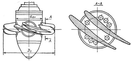 Поворотно-лопастные гидротурбины используют в диапазоне напоров от 3 — 5 до 35 — 45 м. В последнее время, стремясь использовать некоторые преимущества этих гидротурбин перед радиально-осевыми, предпринимаются небезуспешные попытки применять их на напоры до 70—75 и даже 90 м. Самые большие в мире по размеру поворотно-лопастные гидротурбины установлены на Саратовской ГЭС (диаметр рабочего колеса 10,3 м). Изготовлены они на Харьковском турбинном заводе. Двухперовая гидротурбина. Увеличение числа лопастей рабочего колеса поворотно-лопастной гидротурбины по мере повышения используемого напора приводит к возрастанию относительного диаметра втулки (d вт/ D 1) и последующему ухудшению энергетических качеств турбины. Для смягчения этого недостатка применяются спаренные (двухперовые) рабочие лопасти, имеющие общий фланец и общую цапфу (рис. 7), что позволяет повысить пропускаемый турбинный расход. Двухперовые гидротурбины не имеют пока широкого распространения из-за конструктивных сложностей. Диагональные гидротурбины (Д). Появление этих гидротурбин обусловлено теми же причинами, что и двухперовых, т. е. стремлением обеспечить возможность работы осевых гидротурбин двойного регулирования в области повышенных напоров, используемых радиально-осевыми турбинами. Отличие диагональных гидротурбин от радиально-осевых заключается в конструкции рабочего колеса, которая представляет собой конусообразную втулку с расположенными на ней под некоторым углом к оси вращения колеса лопастей (число их доходит до 14), поворачивающихся относительно своих осей (см. рис. 3, д). Втулка рабочего колеса, несмотря на свои относительно большие размеры, чем размеры втулки у поворотно-лопастных гидротурбин, не создает стеснения потока, и благодаря этому за рабочим колесом нет участка с резким расширением сечения, как в осевых турбинах, что в сочетании с другими особенностями диагональных турбин обеспечило им более высокие энергетические качества. Максимальное значение к.п.д. диагональной гидротурбины на 1,5—2,5 % выше, чем осевой. Вместе с тем они сложнее по конструкции, чем осевые и радиально-осевые, а в ряде случаев уступают последним и по кавитационным качествам. Диагональные гидротурбины еще не имеют широкого распространения (они установлены на Бухтарминской и Зейской ГЭС), однако, как показывают исследования, они могут оказаться очень эффективными в диапазоне напоров от 35— 40 до 150—200 м и особенно при больших колебаниях нагрузки. Часть из рассмотренных гидротурбин может быть использована не только в вертикальном, но и в горизонтальном исполнении. Кроме того, реактивные турбины могут быть выполнены обратимыми, что, в частности, очень важно при строительстве ГАЭС.