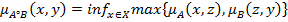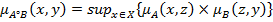 В случае конечного множества Х матрица нечеткого отношения А○В равна максиминному произведению матриц нечетких отношений А и В, то есть получается получаем с помощью тех же операций, как и матрицу произведения обычных отношений. Максиминым произведением нечетких отношений А и В на множестве Х является нечеткое отношение, которое определяется следующей функцией принадлежности: