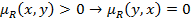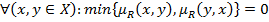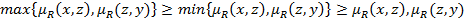 Свойства нечетких отношений. Нечеткие отношения могут иметь свойства рефлексивности, антирефлексивности, симметричности, антисимметричности, транзитивности. Нечеткое отношение R на множестве Х называется рефлексивным, если для произвольного Для конечного множества Х главная диагональ матрицы рефлексивного нечеткого отношения состоит из единиц, как, например, для отношения «приблизительно равны» на множестве чисел. Нечеткое отношение R на множестве Х называется антирефлексивным, если для произвольного Нечеткое отношение R на множестве Х называется рефлексивным, если для произвольного Антирефлексивным является отношение «намного больше» на множестве чисел. Нечеткое отношение R на множестве Х называется симметричным, если для произвольного Матрица симметричного нечеткого отношения, заданного на конечном множестве, является симметричной относительно главной диагонали. Пример симметричного нечеткого отношения – это отношение «сильно отличается по значениям» на множестве чисел. Нечеткое отношение R на множестве Х называется антисимметричным, если для произвольного Антисимметричным является, например, нечеткое отношение «намного больше». Свойство антисимметричности может быть описано двумя следующими эквивалентными способами: Примечание, любое произвольное нерефликсивное (несимметричное) не является обязательно антирефлексивным (антисимметричным). Нечеткое отношение R на множестве Х называется транзитивным, если выполняется соотношение Свойство транзитивности зависит от способа определения произведения нечетких отношений. Если максиминным, минимаксным и максимультипликативным произведением отношения R самого на себя обозначим соответственно Таким образом нечеткое отношение, которое является минимаксно транзитивным, является транзитивным и с точки зрения других двух операций, а отношение, которое является максимультипликативно транзитивным, может таким и не быть с точки зрения других операций умножения. Для обычного четкого отношения максиминна и максимультипликативна транзитивности являются эквивалентными обычной транзитивности четкого отношения. Используя термин «транзитивность нечеткого отношения» - считается, что это максиминна транзитивность, то есть для произвольных x,y