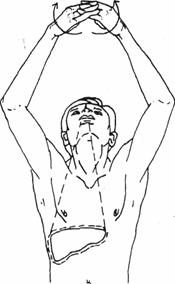 2. Опустите руки свободно вдоль тела и разверните их так, чтобы ладони были обращены наружу. 3. Медленно поднимайте руки через стороны, ладони вверх. При этом делайте медленный и глубокий вдох. Продолжайте поднимать руки до тех пор, пока они не окажутся над головой. 4. Посмотрите вверх и глазами проследите за движением рук над головой. 5. Сплетите пальцы рук над головой. Теперь ваши ладони смотрят вниз. 6. Разверните ладони так, чтобы они были направлены вверх к потолку. 7. Толкните верх основания ладоней и наклонитесь в пояснице немного влево для <того, чтобы правая сторона, где находится печень, больше растянулась.