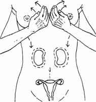 7. Направьте свое сознание на Дворец Яичников, который включает область влагалища и два яичника, расположенные по обе стороны и немного выше влагалища. Почувствуйте, как цзин спускается из почек вниз, во Дворец Яичников. 8. Сдвиньте ладони ниже и накройте ими Дворец Яичников. 9. Втяните глазные мышцы и используйте силу промежности, закрывая и напрягая губы влагалища и одновременно напрягая и втягивая анус.