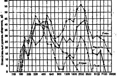 Рис. 4. Невербальная экстралингвистическая информация голоса оказывается более помехоустойчивой (по сравнению с лингвистической) не только по отношению к действию шума, но и по отношению к частотному ограничению спектра. График показывает, что ограничение высоких частот до 400 Гц почти полностью разрушает лингвистическую информацию (разборчивость слов падает до 5,5%) определение же эмоций в таком сигнале, также как и узнавание диктора, в значительной степени сохраняются, 60% и 70% соответственно (по Морозов и др., Язык эмоций, мозг и компьютер, 1989). Искусство и наука общения невербальная коммуникация 29 как правило, более крупную гортань и, соответственно, более низкие голоса по сравнению с низкорослыми и худыми людьми. Указанные закономерности находят отражение в высоких коэффициентах корреляции между высотой голоса людей, с одной стороны, и их полом, возрастом и весом, с другой стороны. Наряду с этим установлено, что важнейшим средством психоакустического кодирования невербальной информации является спектр звука, определяющий, как известно, тембр голоса. Интегральный спектр голоса и речи с различным эмоциональным содержанием существенно различаются, особенно в высокочастотных областях спектра (см. рис. 5). Так, для гнева характерно усиление высоких обертонов, что приводит к увеличению звонкости, «металличности» тембра, а для страха— наоборот— сильное падение высоких обертонов, что делает голос глухим, «тусклым», «сдавленным». Радость приводит к смещению формантных частот в более высокочастотную область, в результате того, что человек говорит как бы «на улыбке» (см. рис. 5 — спектр голоса Ф. Шаляпина при выражении разных эмоций). При распознавании знакомых и незнакомых людей по звуку их голоса (индивидуально-личностная невербальная информация) испытуемые указывают, что они ориентируются на свойственное разным людям различие в тембрах (т. е. в спектрах) голосов наряду с интонационными и другими особенностями их речи (Пашина, Морозов, 1990). Сила голоса и в особенности динамика ее изменений во времени — также важное акустическое средство кодирования невербальной информации. Так, для печали характерна слабая, а для гнева — увеличенная сила голоса и т. п. Изменение силы голоса во времени - весьма информативный показатель: медленные ее нарастания и спады (также как и высоты тона) характерны для печали («плачущие интонации»), а резкие взлеты и обрывы - для гнева (см. рис. 6). Подчеркнем, что именно динамика акустических В. П. Морозов