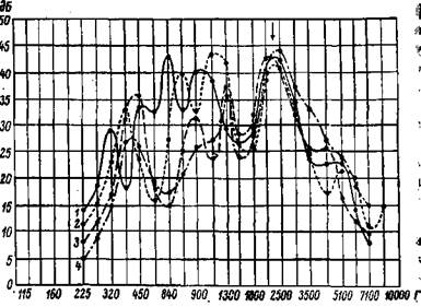 Рис. 12. Важнейшее эстетическое свойство голоса хороших профессиональных певцов - приятная на слух звонкость, «серебристый тембр» — зависит от присутствия в голосе усиленных по амплитуде высоких обертонов (в области 2300-3000 Гц), получивших название высокая певческая форманта (ВПФ). На рисунке представлены наложенные друг на друга спектры голоса известных мастеров вокального искусства: 1 — Ф. Шаляпина (гласи. А, нота mi1), 2 - П. Лисициана (гласи. А, нота sol1), 3 — Э. Карузо (гласи. О, нота 1а1, 4 — Г. Зобиана (гласи. А, нота 1а1). Хорошо видно, что ВПФ, отмеченная стрелкой, у баса, баритона и двух теноров имеет большой уровень энергии и практически совпадает по своему расположению на шкале частот (По Морозову, 1977). Искусство и наука общения невербальная коммуникация 57