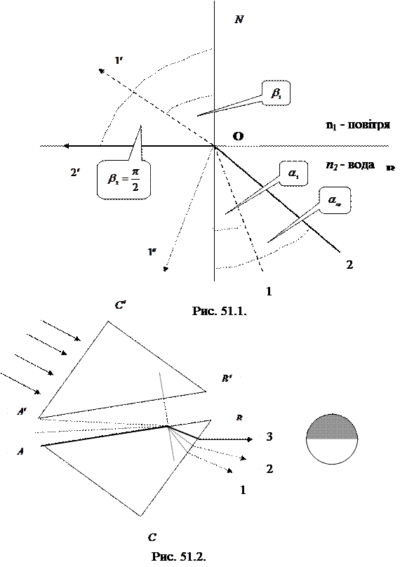 Порядок виконання роботи. Рефрактометрами називаються прилади для вимірювання показників заломлення світла в твердих, рідких та газоподібних речовинах. В даній роботі для визначення коефіцієнта заломлення водних розчинів сахарози використовується рефрактометр Аббе типу УРЛ, принцип дії якого оснований на використанні явища повного внутрішнього відбивання світла. Повне внутрішнє відбивання світла має місце при переході світла із оптично більш густого середовища в менш густе. Середовище з показником заломлення При збільшенні кута падіння Якщо ж кут падінні стає більшим граничного значення, то промінь повністю відіб’ється від межі розділу двох середовищ. Це явище отримало назву явища повного внутрішнього відбивання світла. Повернемо промені і заставимо їх йти із повітря в воду. Картина залишиться тою тією ж самою – це витікає із принципу зворотності світових променів, тільки промені падаючі і заломлені поміняються місцями. Те ж саме буде і з кутами – кути Основною частиною рефрактометра Аббе (рис. 51.2) є дві скляні призми – вимірювальна призма АВС, яка виготовлена із скла з високим ( Крапля рідини розміщується на гіпотенузної грані вимірювальної призми і піджимається до неї освітлювальною призмою так, щоб між гіпотенузними гранями призм залишився дуже тонкий (0,1 – 0,2 мм) шар рідини. Грань