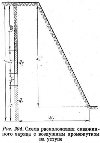 Под конструкцией заряда понимают: 1. Форму и расположение заряда ВВ в зарядной камере; 2. Место расположения инициатора в заряде; 3. Величину и качество забойки. В зависимости от формы зарядной камеры заряд ВВ может быть: 1. Удлиненный (колонковый), когда длина его больше не менее чем в 3 раза поперечного сечения; 2. Сосредоточенный, определяемый формами зарядной камеры — сферический, кубический и т. д; 3. Рассредоточенный. Рассредоточение заряда может быть осуществлено либо оставлением пустот между частями зарядов ВВ или зарядом и забойкой, так называемых воздушных промежутков, либо промежутки между частями заряда заполняют различными инертными материалами. Инициирование всего заряда или каждой его части можно осуществлять одним или несколькими детонаторами или детонирующим шнуром. Место инициирования колонкового заряда оказывает существенное влияние на эффективность взрыва. При расположении боевика в заряде ВВ первым от устья шпура способ инициирования называют прямым, а при расположении патрона боевика у забоя шпура или скважины — обратным. Для детонации малочувствительных ВВ необходим мощный начальный импульс, осуществляемый с помощью более чувствительных и мощных ВВ, в связи с чем весьма важным является определение места расположения патрона-боевика в колонковом заряде для инициирования всего заряда. Коэффициенты заполнения шпура по сечению и плотность ВВ связаны с конструкцией заряда и определяют его объемную концентрацию энергии. На основании теоретических и экспериментальных работ, проведенных под руководством акад. Н. В. Мельникова, разработаны теоретические основы по выбору наиболее целесообразной конструкции колонкового заряда и выполнены инженерные расчеты по определению параметров воздушных промежутков при взрывании зарядов в различных горно-геологических условиях. Сущность этого метода ведения взрывных работ заключается в том, что для эффективного использования энергии взрыва колонковых зарядов с точки зрения дробления среды необходимо рассредоточение последних по длине шпура или скважины с оставлением между ними воздушных промежутков. Физический смысл происходящих при этом явлений состоит в том, что при рассредоточении осуществляется снижение пикового давления ударной волны и равномерное перераспределение энергии ВВ по всей длине скважины или шпура в результате чего увеличивается полезное использование энергии взрыва. Это обеспечивает получение равномерного дробления горной массы заданной кусковатости из условий максимального использования погрузочно-транспортных средств, снижения расхода ВВ и стоимости работ. При наличии в заряде воздушных промежутков время воздействия продуктов взрыва на взрываемую среду удлиняется, тем самым создаются условия эффективного ее разрушения. Напряжения, возникающие в среде при взрыве зарядов с воздушными промежутками в первый период времени ниже, чем при обычных. В то же время в разрушаемом массиве разрыв поверхностного слоя происходит быстрее, чем при обычных зарядах. Таким образом, при наличии воздушных промежутков снижаются скорости распространения процесса возмущения среды в начальный период, удлиняется время взрывного воздействия на среду и снижается пиковое давление с сохранением энергии и последующим перераспределением ее для 