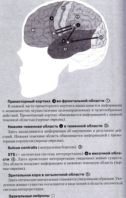В действительности головной мозг обладает оптической системой обработки и интерпретации, которая выполняет эти функции. Эта система по своим возможностям намного превосходит все, что еще недавно было известно об обработке оптических сигналов в головном мозге. Воспринимаемое нашими глазами сначала превращается так называемой зрительной корой в то, что мы видим перед собой. Сети нервных клеток зрительной коры находятся в затылочной области. Оптическая система подготовки и интерпретации расположена за этими сетями нейронов, но связана с ними нервными волокнами, которые тянутся с обеих сторон от зрительной коры вперед к височной доле коры головного мозга. В англоязычной специальной литературе эта система называется в соответствии с местом ее расположения: STS.[37]Обработанная здесь информация по нервным волокнам передается дальше, а именно: сначала к нервным клеткам представлений об ощущениях (в нижнем теменном кортексе), а оттуда — к командным нейронам (в премоторном кортексе). Оптическая система обработки и интерпретации (STS) в последние годы предметом интенсивного изучения.[38] Эта система работает подобно мастерской, в которой вся оптическая информация, получаемая зрительной корой от глаз, подвергается чрезвычайно быстрой, практически синхронной обработке. Сначала система проверяет, действительно ли ей необходимо включаться в работу. Она включается только тогда, когда зрительная кора дает образы живых действующих субъектов. Как только наблюдаемое действие, которое выполнял человек, начинает осуществлять аппарат или робот, система прекращает свое функционирование. Причина такого избирательного подхода заключается в том, что оптическая система обработки и интерпретации не имеет иной задачи. кроме толкования того, что позволяет сделать выводы о намерениях или ощущениях других людей или других живых существ: она анализирует движения тела, выражения лица, движения рта и — одно из главных занятий — взгляды других существ.