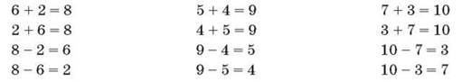 IV. ВИВЧЕННЯ НОВОГО МАТЕРІАЛУ 1. Робота за підручником (с. 9-10) Завдання 42. Усне виконання завдання — Якими монетами можна дати 10 копійок здачі? Розгляньте різні варіанти. Завдання 43. Самостійне виконання завдання Один учень працює біля дошки. Завдання 44. Усне виконання завдання — Складіть, розв’яжіть і порівняйте задачі. Якими чотирма грошовими купюрами можна заплатити за шарф? Завдання 45. Усне виконання завдання Тато купив 8 кг капусти і 2 кг буряків. Про що можна дізнатися за цими даними? Завдання 46 Учні розв’язують і порівнюють задачі. — Чим схожі задачі? — Чим відрізняються? — Чому перша задача розв’язується додаванням, а друга відніманням? Завдання 47. Усне виконання завдання Учні знаходять суми і різниці за таблицею. Завдання 48. Колективне опрацювання матеріалу — Прочитайте вирази. Що дістали, коли від суми відняли доданок? — Розв’язуючи ці приклади, ви помітили, що якщо від суми відняти одне з доданків, дістанемо інший доданок. Щоб знайти невідомий доданок за відомою сумою та іншим доданком, треба від суми відняти відомий доданок. — Один доданок дорівнює 5, сума дорівнює 9. Знайдіть інший доданок. — Сума двох однакових доданків дорівнює 8. Знайдіть один з цих доданків. Завдання 49. Колективне опрацювання матеріалу — З кожного виразу на обчислення суми складіть два вирази на обчислення різниці. Завдання 50. Колективне опрацювання матеріалу — Перевір додавання відніманням за зразком. Зразок. 47 + 21 = 68; 68 - 21 = 47. — Щоб перевірити дію додавання, можна від суми відняти один з доданків. Якщо дістанемо другий доданок, то розв’язання правильне. 2. Фізкультхвилинка