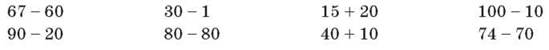 Гра триває до тих пір, поки учні кожної команди не складуть усі вирази з цими числами. Перемагає команда, яка раніше за інших складе правильно «ланцюжок» взаємопов’язаних виразів. 2. Обчислення значень виразів — Знайдіть значення виразів, у яких зменшуване — кругле число.