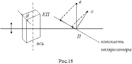 Таким образом, если пропустить естественный свет через вырезанную параллельно оптической оси кристаллическую пластинку (см. рис. 18), из пластинки выйдут два поляризованных во взаимно перпендикулярных плоскостях луча, между которыми будет существовать разность фаз, определяемая формулой (3.2). При падении на КП естественного света интерференции не будет, так как в этом случает о и е волны некогерентны (принадлежат разным цугам).