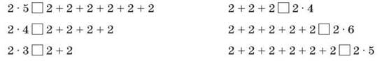 Під час виконання завдання учні мають дати відповідь, не обчислюючи значень цих виразів. Наприклад: 2 · 5 > 2 + 2 + 2 + 2 + 2 + 2, тому що 2 · 5 — це сума п’яти двійок, а праворуч дана сума шести двійок. Date: 2015-09-05; view: 548; Нарушение авторских прав |